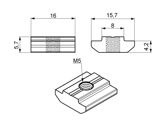 Nakrętka wpustowa 8 z gwintem wewnętrznym M5 dzięki swojej powierzchni tworzy połączenie mogące przenosić duże obciążenia. Ze względu na wymiary przekroju montaż nakrętki jest możliwy jedynie poprzez wsunięcie jej w rowek profilu.