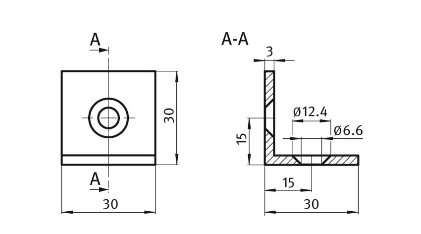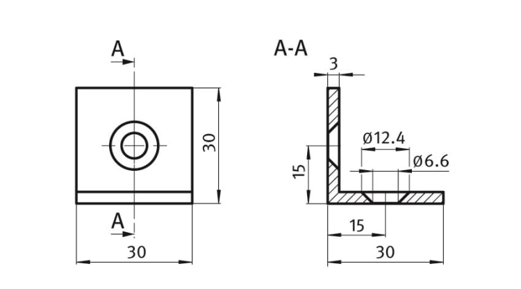 Kątownik 30x30 przeznaczony do łączenia dwóch profili aluminiowych pod kątem 90°. Może również służyć do podparcia blatu na konstrukcji z profili aluminiowych.