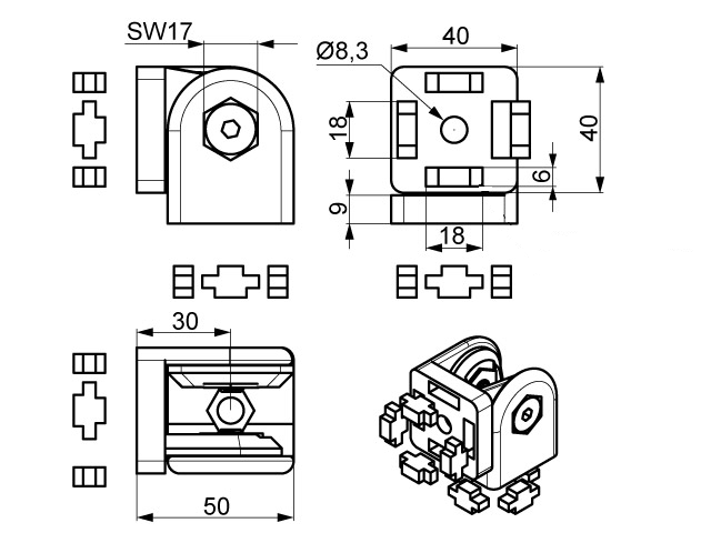 Przeznaczony do montażu z profilami serii 40 FB. Dostępny także wariant z dźwignią zaciskową (FB3PD4040).